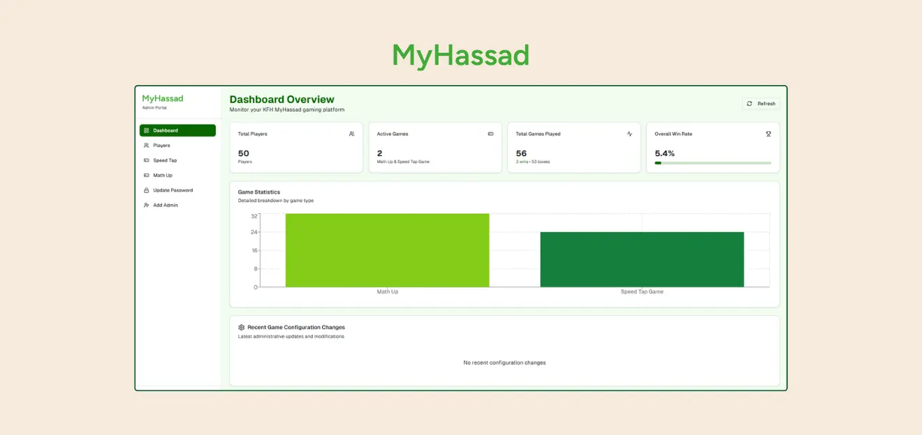 MyHassad 2025 was created to deliver a fast, secure, and engaging gamified experience for Kuwait Finance House (KFH). The platform combined two interactive games—Speed Tap and MathUp—with CPR-based validation, sequential chance allocation, and anti-abuse mechanisms to ensure fairness for all participants.